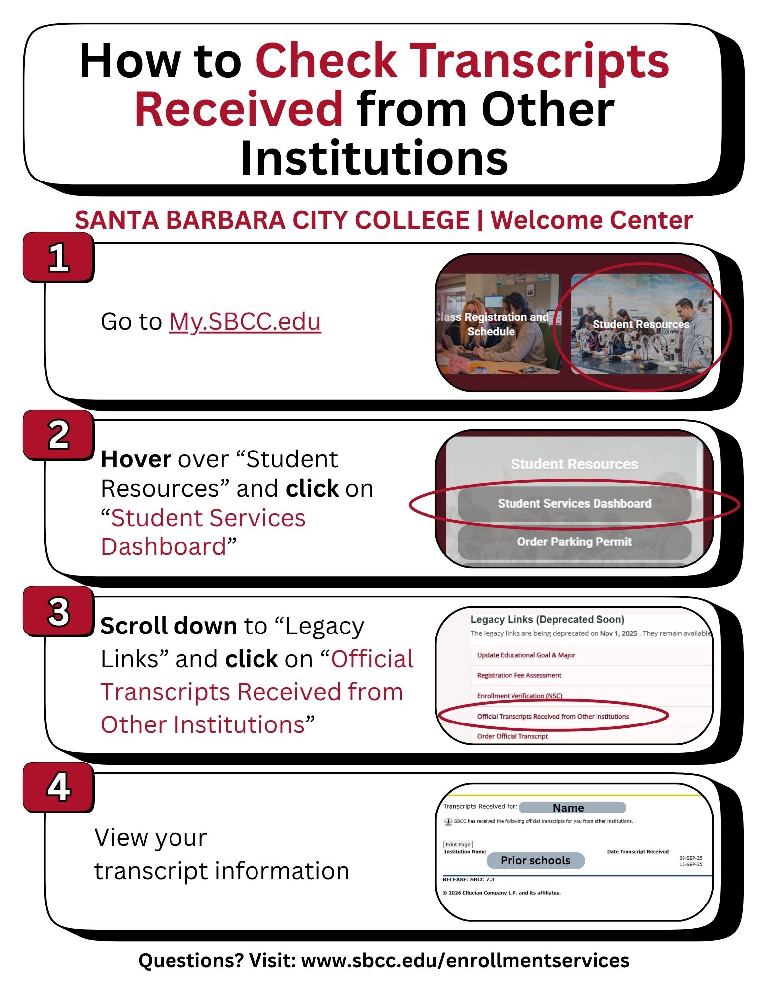 2. Your official transcripts have been received by SBCC Admissions & Records. How to submit your transcripts · Verify receipt